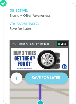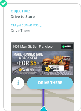 Piensa en el objetivo final de tu campaña. En última instancia, ¿qué quieres que hagan los usuarios? ¿De qué modo puedes llamar a la acción sin ser autoritario? Elige un CTA de Waze para fortalecer el mensaje de tu campaña. Las interacciones principales provienen del CTA de Waze.
