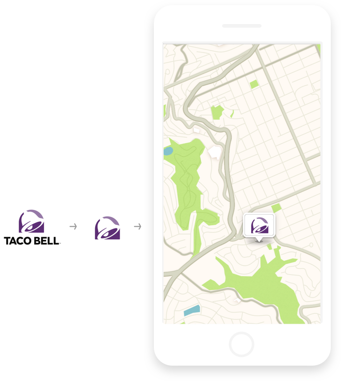 Utiliza el ícono más reconocible de tu marca para indicar con claridad la promoción en la ubicación marcada. No incluyas texto en los pins a fin de mejorar la visualización en la pantalla.