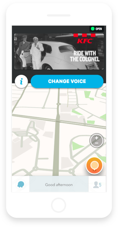 Los comandos de voz ofrecen una plataforma exclusiva para llegar a las personas mientras conducen. Los anunciantes brindan comandos de navegación personalizados en el app, lo que perite conectar con un público de conductores y pasajeros a través de una experiencia de marca memorable.