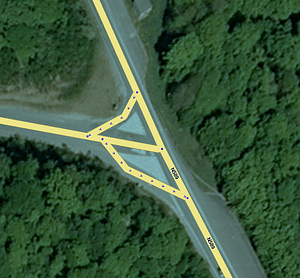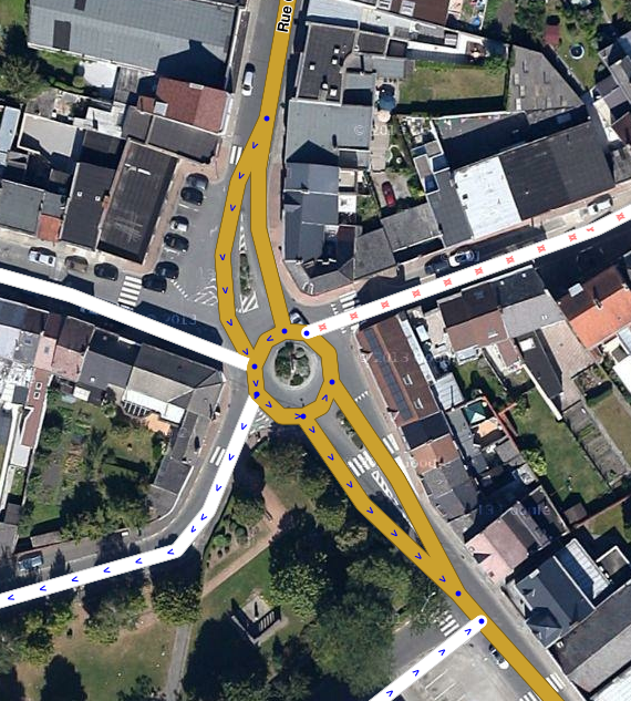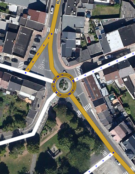 - Kod kreiranja kružnog toka, sve ceste koje u njega ulaze ili izlaze, prvo moraš spojiti u jednu točku koja se nalazi negdje u sredini. Zatim podesi geometriju kako bi nakon dodavanja kruga, točka spajanja s kružnim tokom došla na željeno mjesto. Tek tada kreiraj kružni tok. Svi segmenti unutar kruga automatski će biti uklonjeni, a skretanja automatski kreirana.