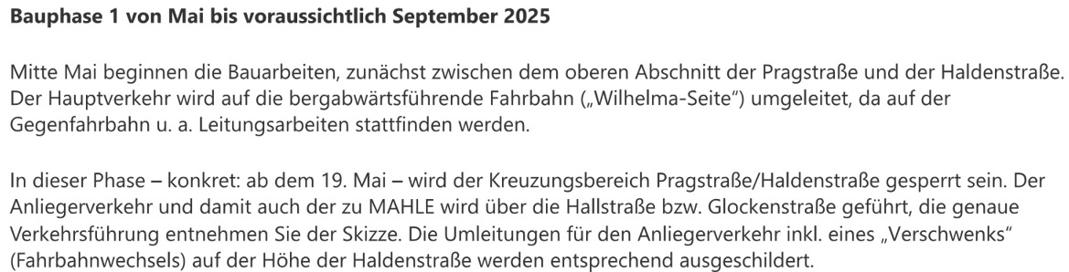 Ich denke man kann es mal bis 31.12.2027 sperren. Leider komme ich gerade nicht an mehr Informationen dran. Ich fahre 2x pro Woche die Strecke von A nach B und würd mich melden, wenn man die Sperrung in die Pragstraße wieder raus nehmen kann. Danke