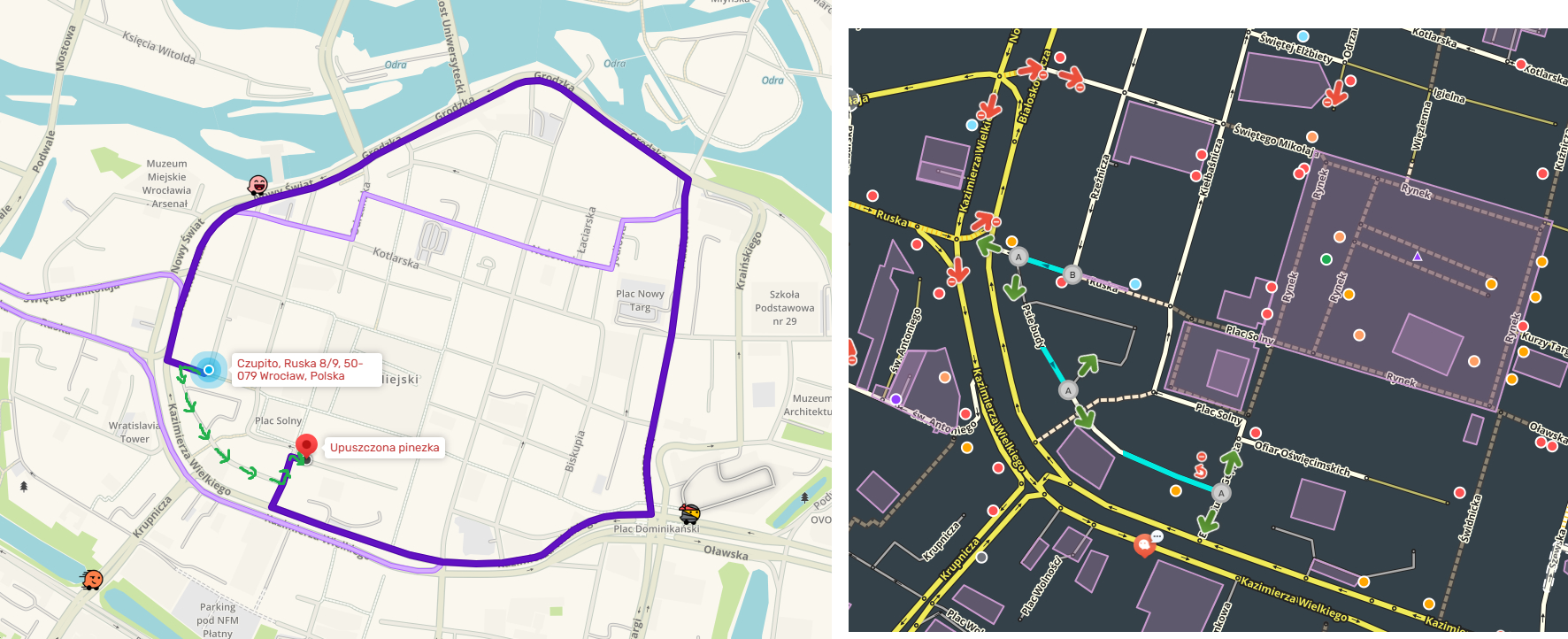 Witam, nawigacja we Wrocławiu koło Rynku, z ulicy Ruskiej, nigdy nie prowadzi ‘w lewo’ w ulicę Psie Budy, kiedy w rzeczywistości można tam skręcić, a węzły w edytorzy mapy, teoretycznie też na to pozwalają. Trasa jest wyznaczana w sposób absurdalny, kompletnie dookoła, wokół całego rynku, gdzie nikt w taki sposób nie jeździ. Załączam zdjęcie wytyczonej trasy przez nawigacje (fioletowy) oraz tego, jak wytyczenie jej powinno wyglądać (zielony).