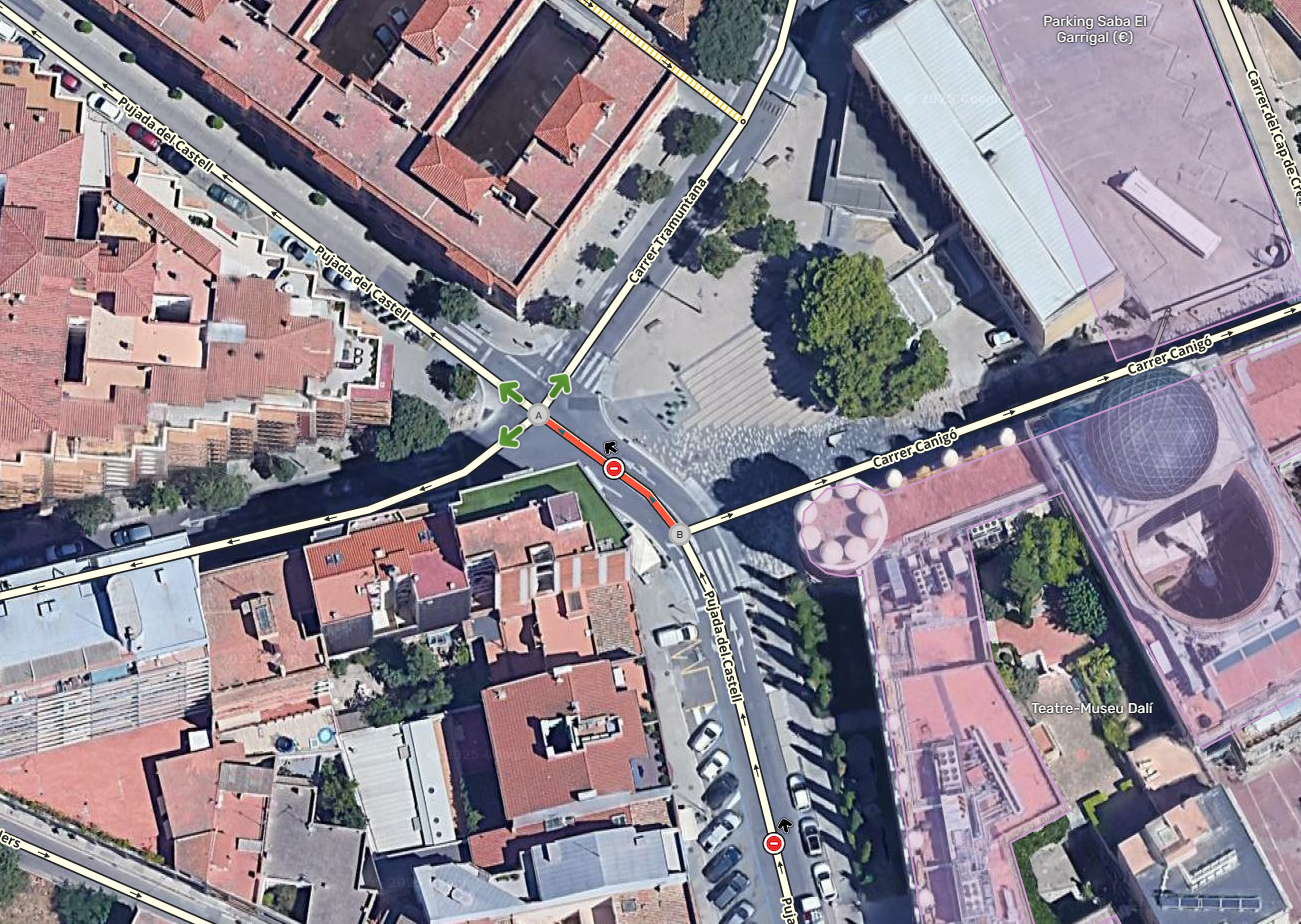 Hola, el tramo con id 130391615 ahora mismo si que está abierto al tráfico pero en sentido inverso. Adjunto imagen. El sentido correcto ahora es de A a B para poder acceder al carrer canigó.