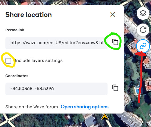 Por otra parte, te agradecemos que acompañes permalinks a los pedidos ingresando a www.waze.com/editor y usando el siguiente ícono en esa pantalla (ver imagen). Asegurate que se muestre de esa manera, copiás y luego pegás por acá o donde quieras compartir.