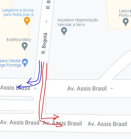 Rua Bogotá, esquina com Assis Brasil. 4 faixas. 2 pra dobrar a esquerda e 2 à direita. (ninguém respeita, mas tem sinalização no chão e tudo)