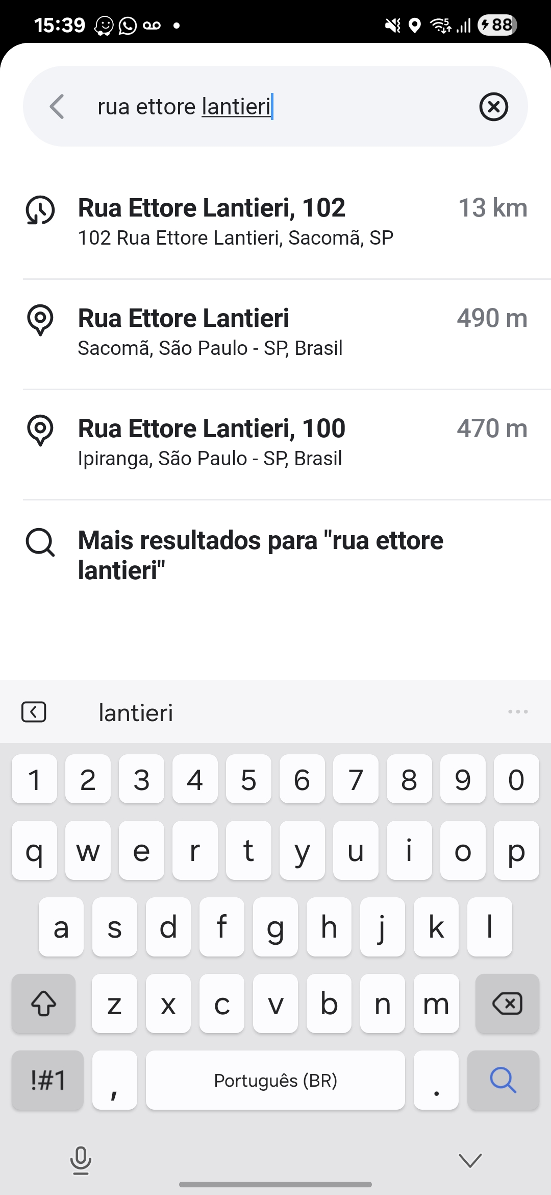 Ao buscar pelo endereço Rua Ettore Lantieri, 102 - Sacomã, São Paulo - SP, 04249-095, o aplicativo apresenta duas opções de localização.