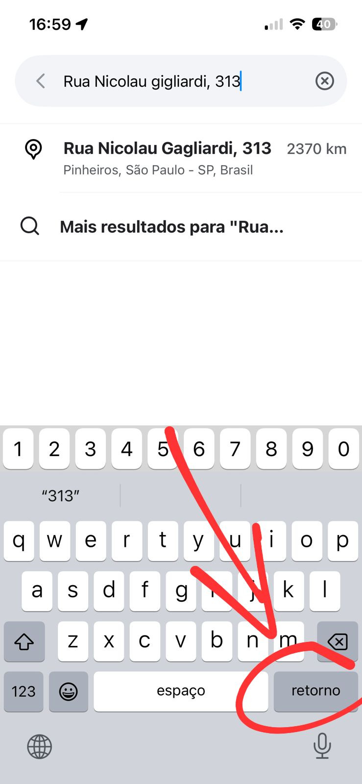 Ao pesquisar o endereço, clique em enter/retorno para confirmar a pesquisa, e irá aparecer o resultado com a localização correta: