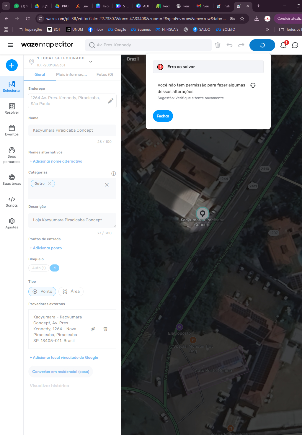 Estou tentando criar um local comercial no Waze Map Editor, porém recebo a mensagem informando que não possuo permissão para concluir a alteração.