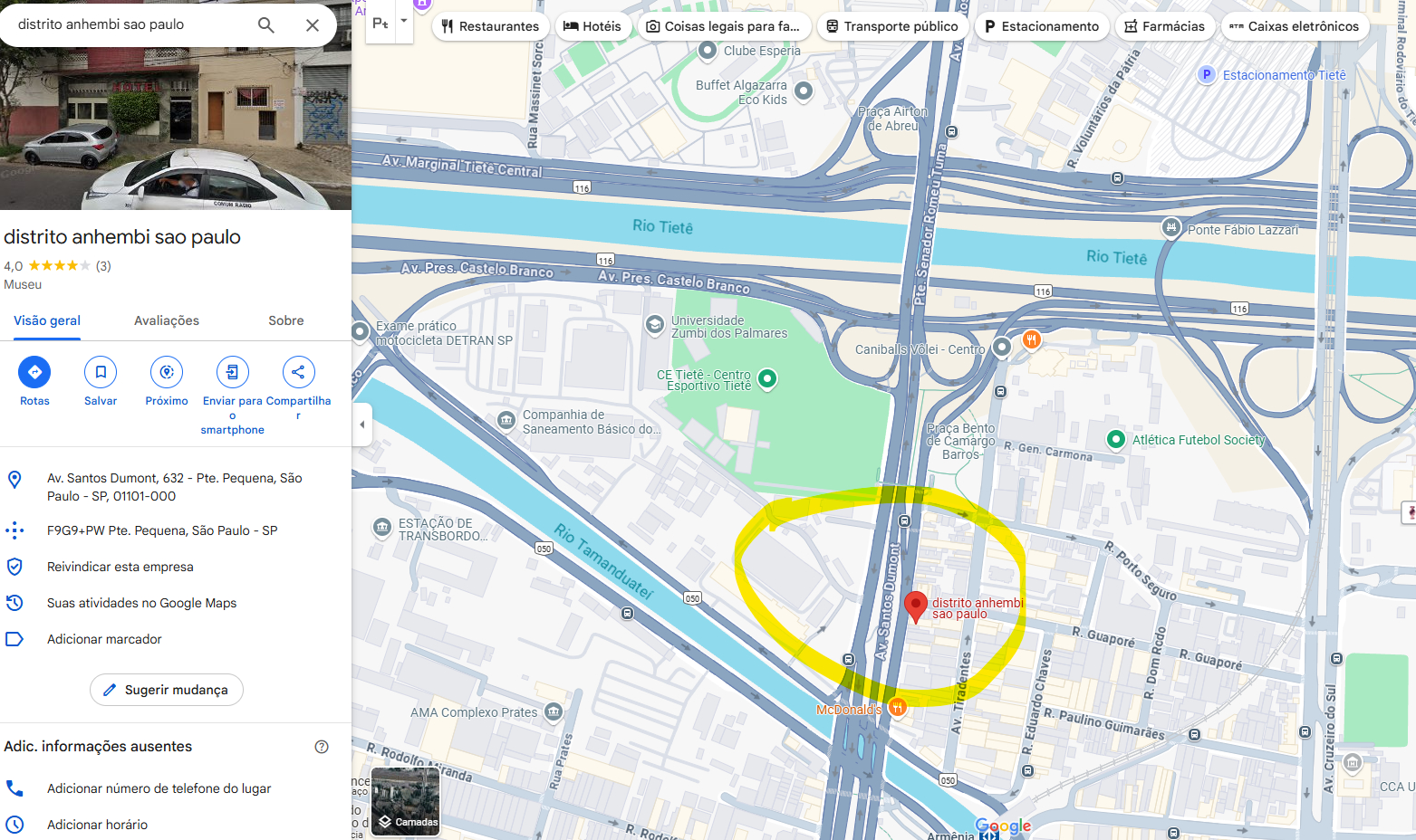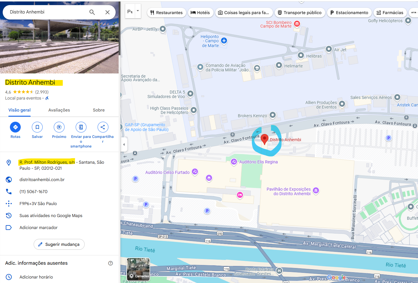 Repare que no GMaps o local denominado “Distrito Anhembi” está classificado como sendo na R. Prof. Milton