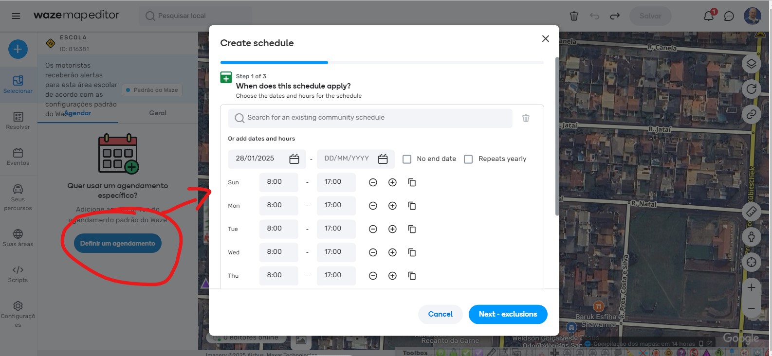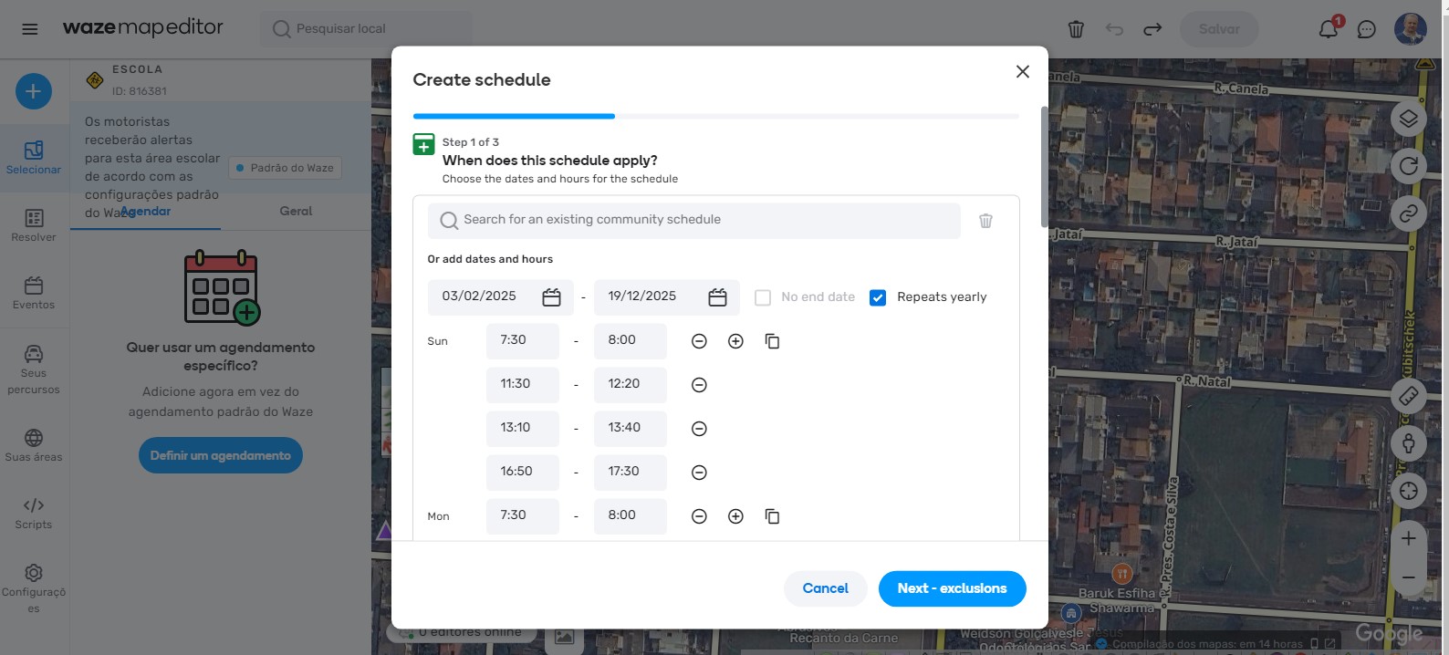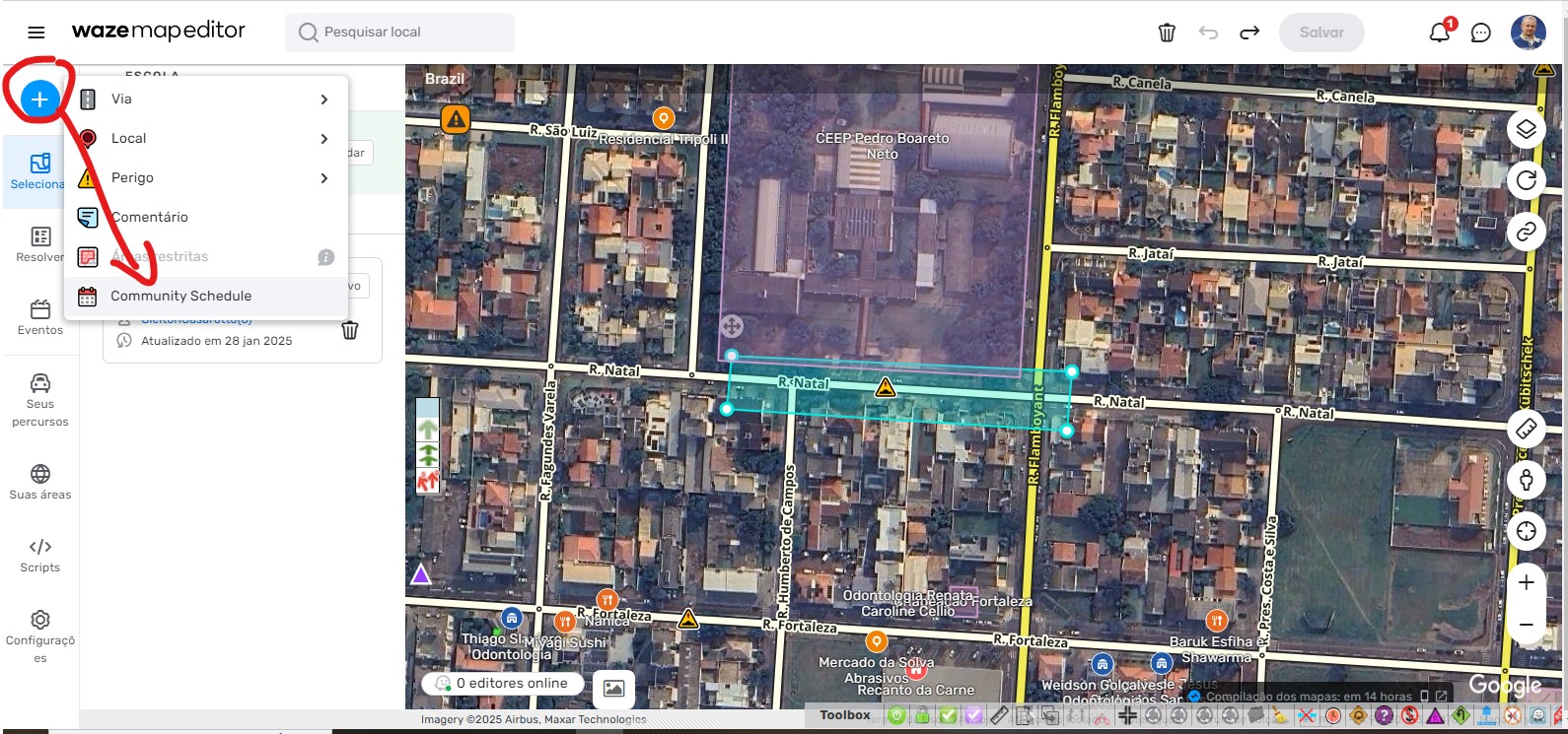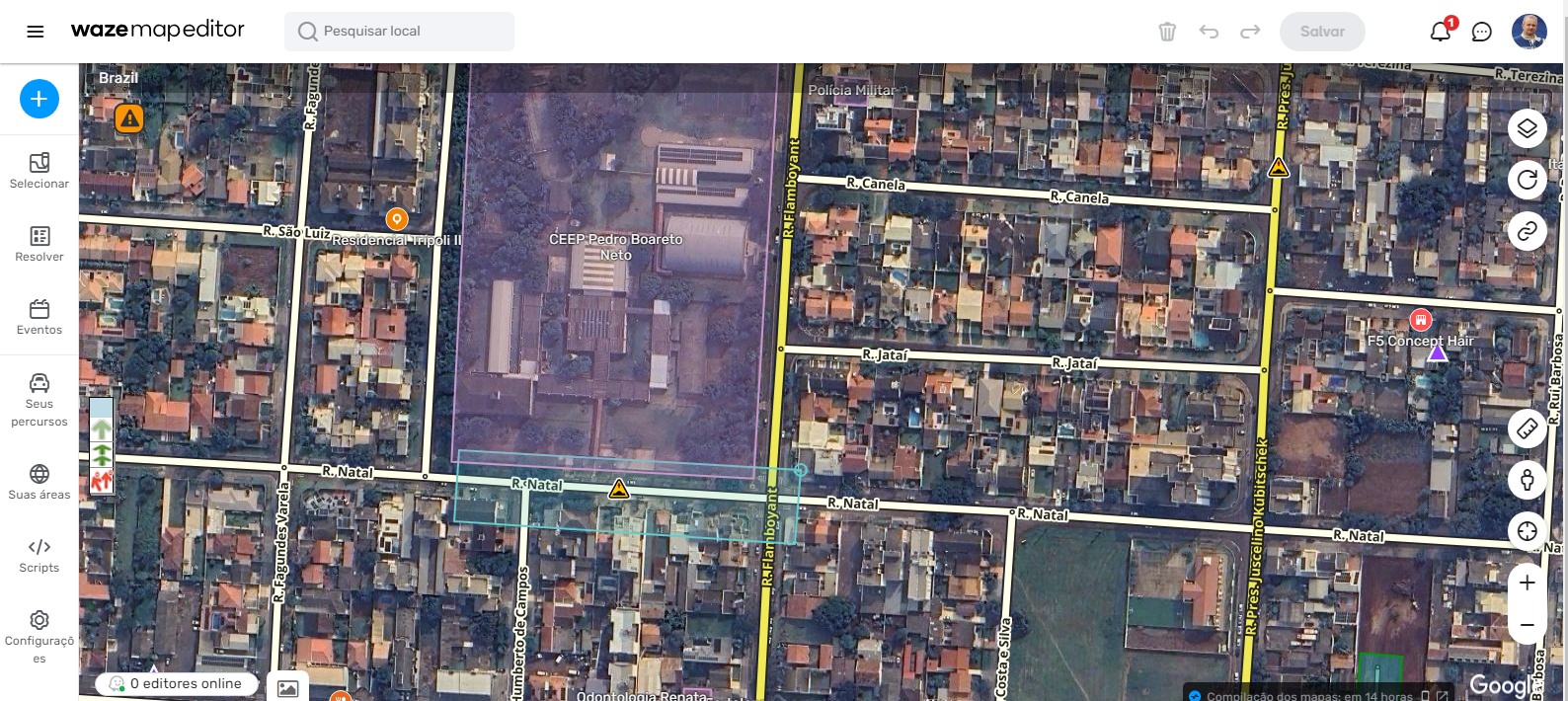 Uma boa pratica de edição é tentar localizar placas ou sinalizações na via que indiquem área escolar e desenhar o polígono para que o alerta seja dado proximo a esse local.