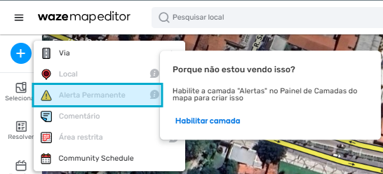 - No menu de criação, clique em “Alerta Permanente”. Se a camada estiver desabilitada, clique em “Habilitar camada” para ativá-la.