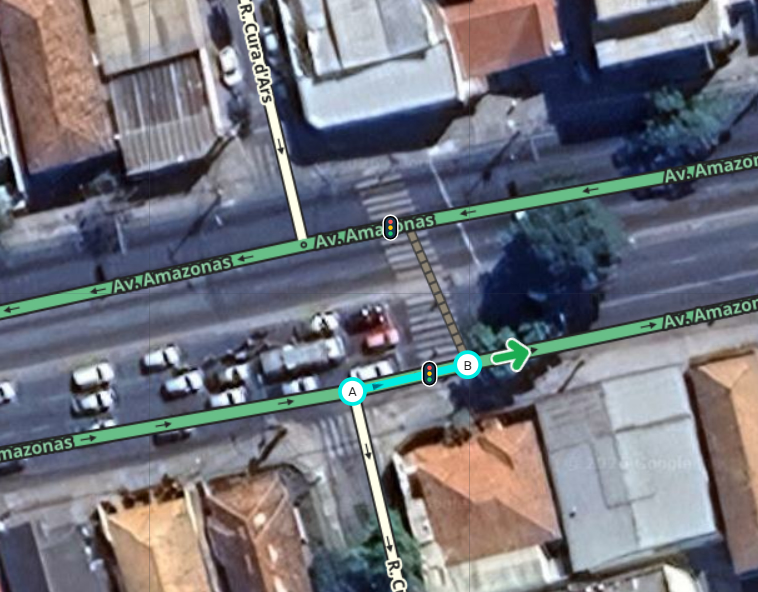 E nos casos em que o semáforo se encontra logo após a junção e não se aplica à via de conversão? Quebramos o segmento ou mapeamos antes da junção, mesmo que não tenha aplicação a quem vai virar?