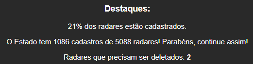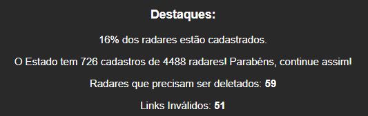 Que tal a porcentagem de radares cadastrados considerar apenas os radares ativos (coloridos) e ignorar os expirados (sem cor)?