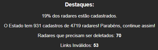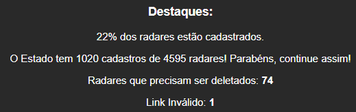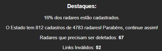 Estamos evoluindo bem no números de radares cadastrados, 360 em 1 mês.