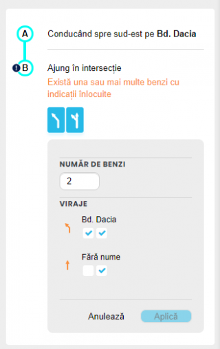 Înainte de a adăuga informațiile de virare de pe benzi, verificați atât vederea aeriană cât și cea stradală pentru a vă asigura de numărul de benzi existente pe segmentul pe care urmează să-l editați. Consultați ”Ce contează la o bandă” pentru mai multe informații.