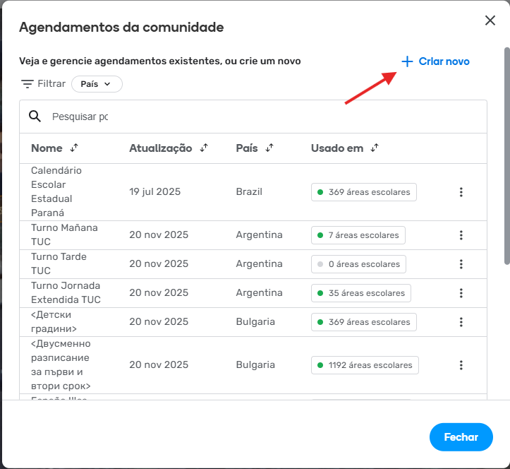 - Um agendamento da comunidade deve ser criado sempre que várias escolas compartilham os mesmos horários, feriados e recessos escolares.