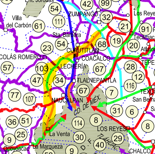 - MEX-57D / Circuito Exterior Mexiquense sección desde T. C. Chamapa - Lechería Cuota hasta T.C. Circuito Exterior Mexiquense (indicador #111). La ruta es estatal directa (EM-D) y parece que el nombre correcto segun la SCT es “Ramal al Circuito Exterior Mexiquense (Cuota)”, sin embargo, propongo nombrarla como “EM-D / Circ. Exterior Mexiquense”
