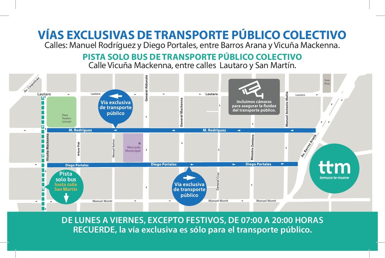 Solicito modificar restricción de circulación en calle Diego Portales en Temuco, que es una vía exclusiva de microbuses pero que abarca ciertas calles, no la totalidad de la vía.