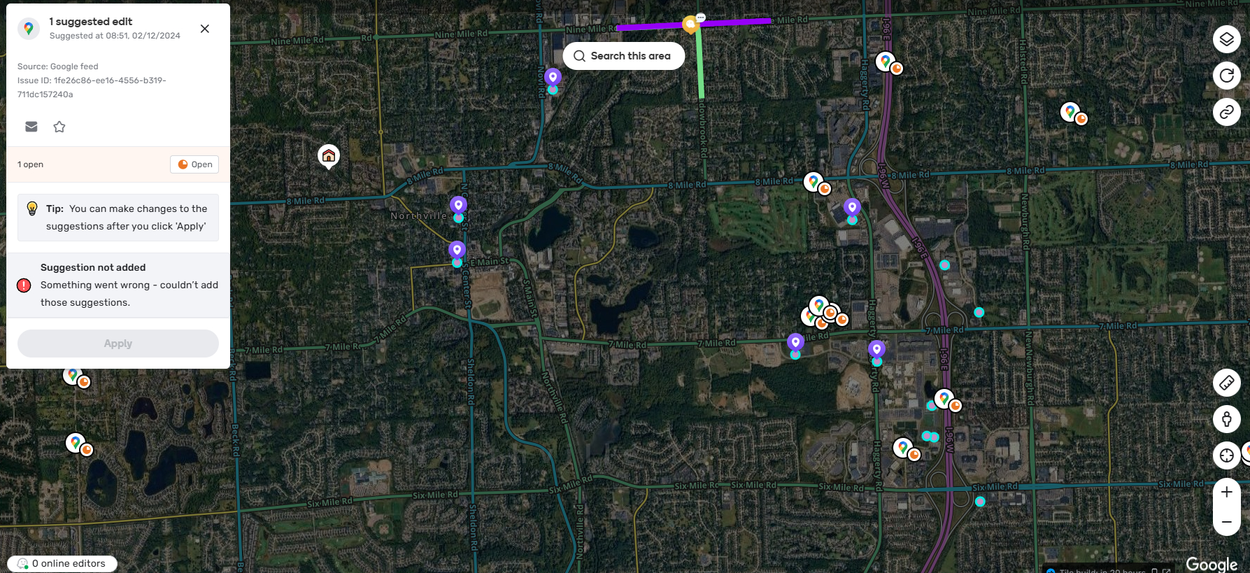 Unable to edit map areas that I was able to edit yesterday. Unable to resolve edit suggestions and no email informing me I’ve been banned. SS provided below of area I was able to edit yesterday.