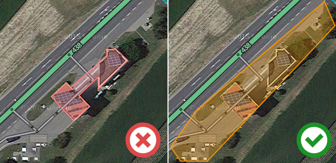 Vľavo je veľmi podrobne, ale nesprávne, zakreslené miesto čerpacej stanice. Vpravo je správne riešenie.