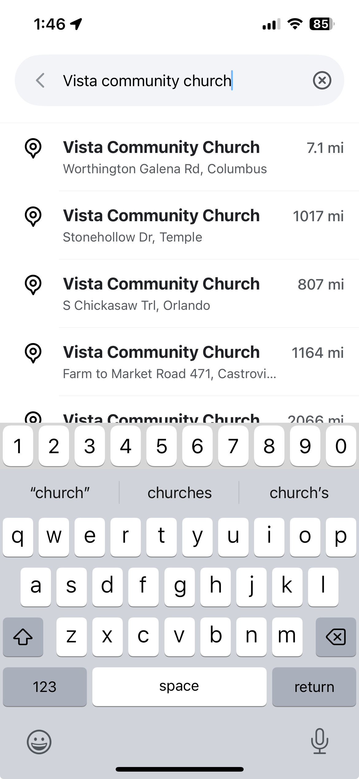 Make sure to remove all past searches and any saved locations of this church and then re-add the church. It will update the navigation. Not doing so will show old info.