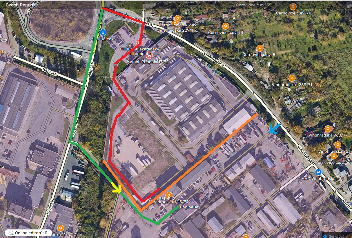 Ještě doplním, že areál Vinohradská 74 Brno má 2 vjezdy, jeden číslovaný jako Vinohradská 74 z ulice Vinohradská na mapě modrou šipkou, druhý preferovaný příjezd z ulice Hájecká žlutou šipkou.