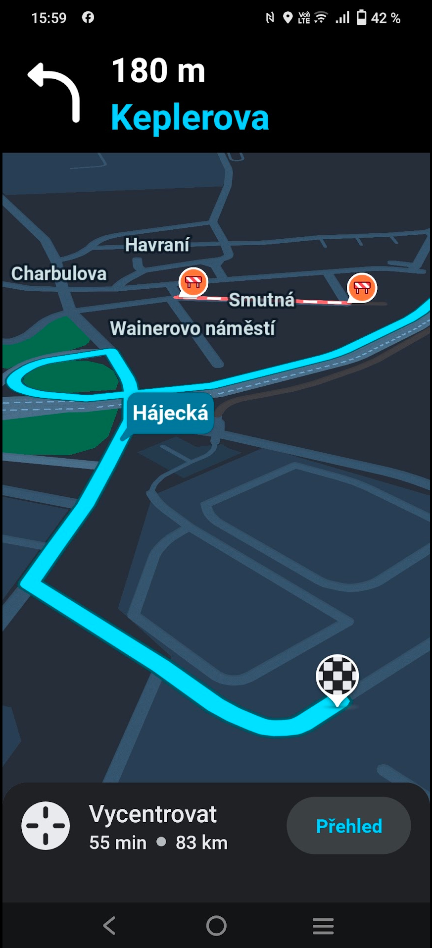 Červeně je chybná trasa kudy mě Waze navigoval.