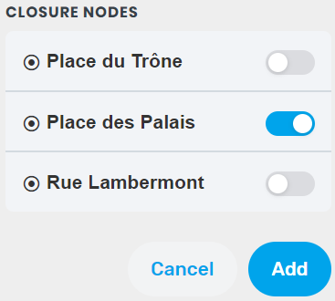 will appear on the map at that junction. - Enable and disable node closures as necessary, by flipping the switch.