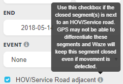 If the segment is paralleling another road in use, or needs to remain closed at all times until the given end time, even if movement is detected, mark the check box at HOV/Service Road adjacent (see picture).