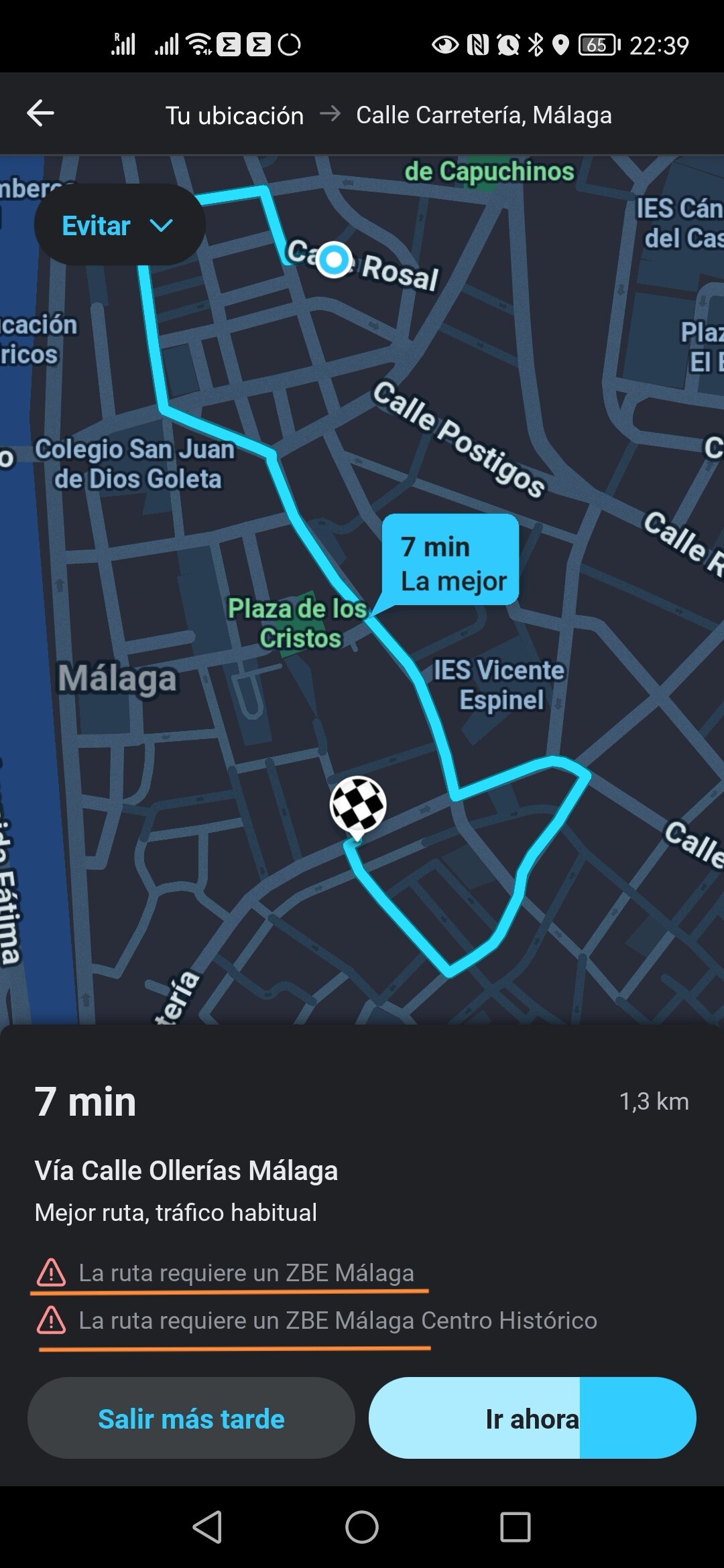 Una vez se active, sólo dejará a los que tengan la etiqueta de emisiones correspondiente. Si tu destino está dentro de la zona, te avisará si no tienes la pegatina, pero podrás seguir navegando hacia allí. Lo único que no te hará atravesar la ZBE para la que no tienes pase si tu destino está al otro lado.