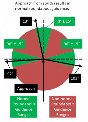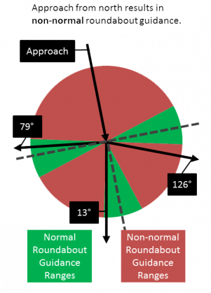 - Al menos una de las salidas de la rotonda, desde la perspectiva del nodo del segmento de entrada, no se presenta en ángulos de 90º (±15°)