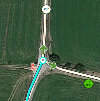 - Si ninguno de los segmentos con ángulo ≤ 45º presenta una combinación mejor que los demás con el nombre o el tipo de vía, todos los segmentos recibirán instrucción, incluido aquellos con ángulo 0º. En estos casos se podría incluso dar la paradoja de que para una salida hacia la izquierda la instrucción sea “mantente a la derecha” porque ya hay otro segmento con un ángulo un poquito mayor hacia la derecha. Esto se puede corregir agregando en el nodo instrucciones forzadas que sean necesarias