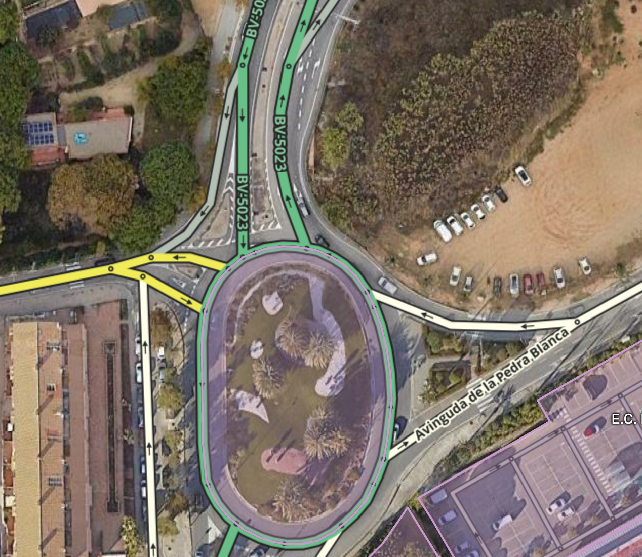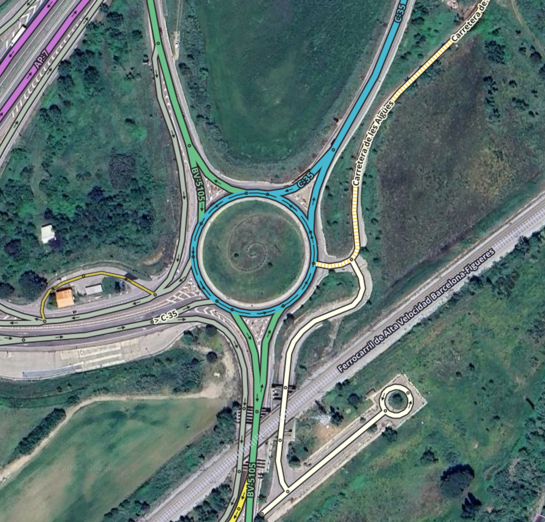 Aunque ando un poco desentrenado, si no me equivoco actualmente se puede poner la guia de carriles en rotondas con lo que posiblemente esta pueda ser una manera de afrontar el problema.