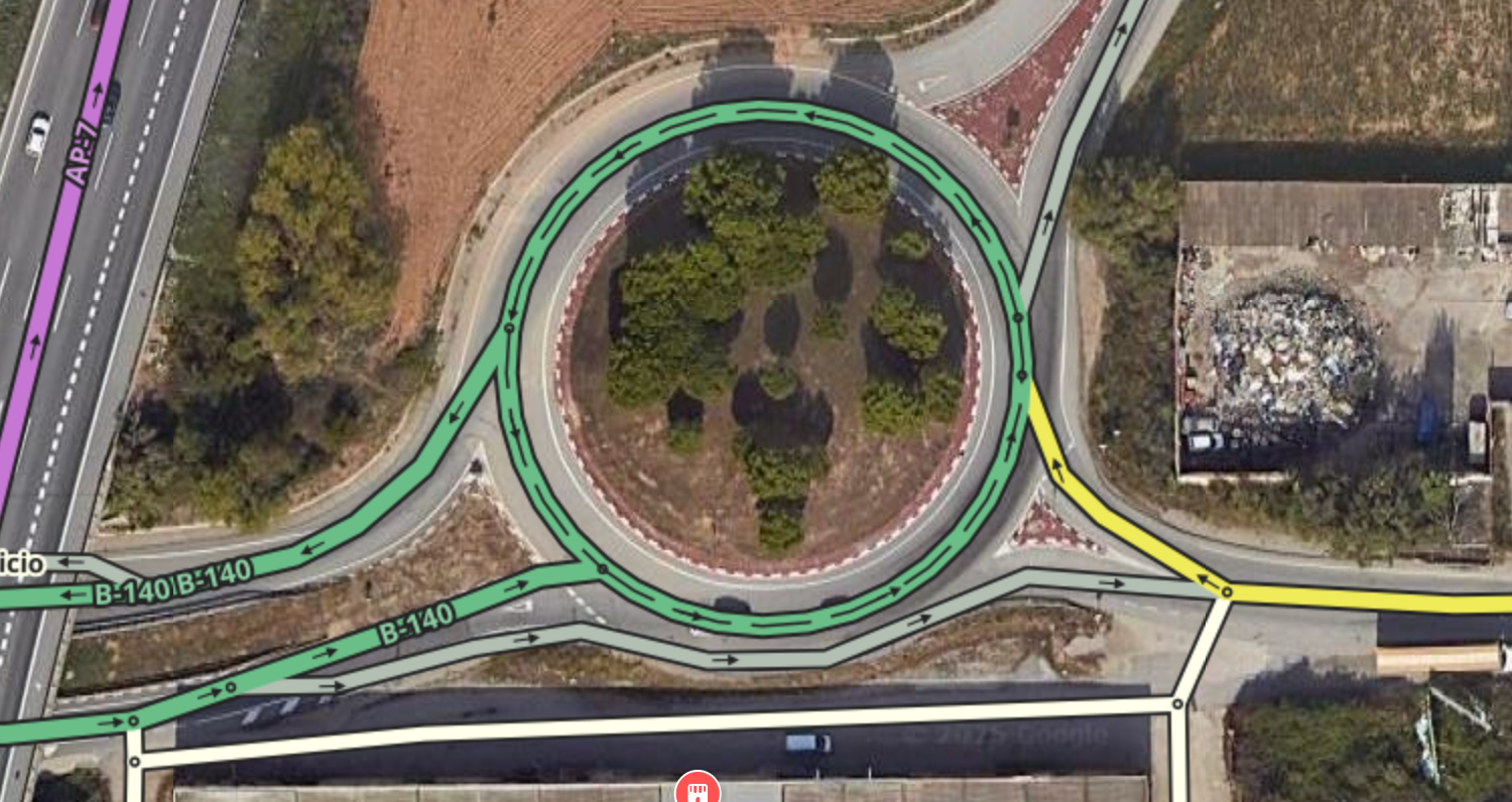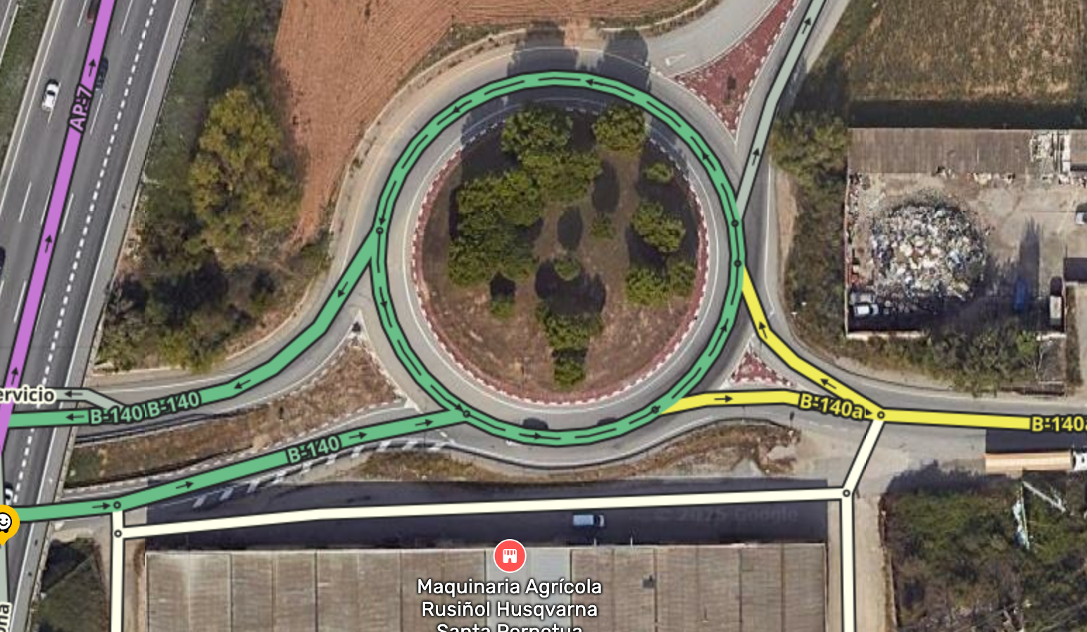 me encuentro con una rotonda (link) de dos carriles que han dividido, donde ahora el carril derecho te obliga a tomar la primera salida, mientras que el carril izquierdo debe tomar la segunda salida, cambiar de sentido y quedarse dando vueltas hasta acabar el combustible.