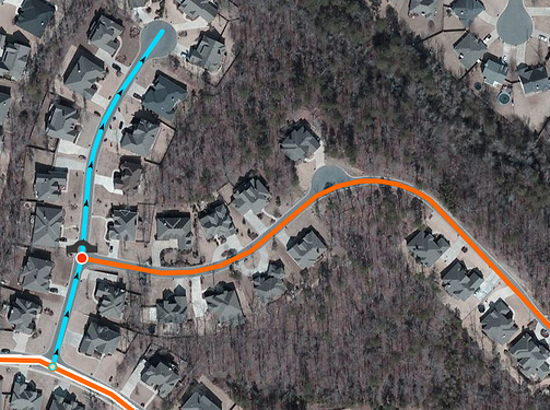 Ao desenhar uma rua que começa e termina na mesma conexão (dois segmentos começando e terminando nos mesmos nós), o descrito acima pode não funcionar e, caso funcione, as restrições de conversão estarão erradas e possivelmente ocasionará problemas no futuro como o exemplo abaixo onde para fins de teste foi interditado o segmento de estacionamento do posto mas o servidor de rota entendeu o contrario.