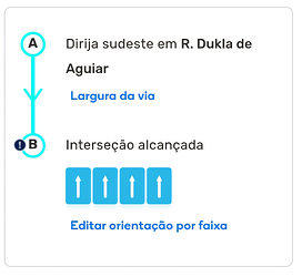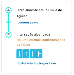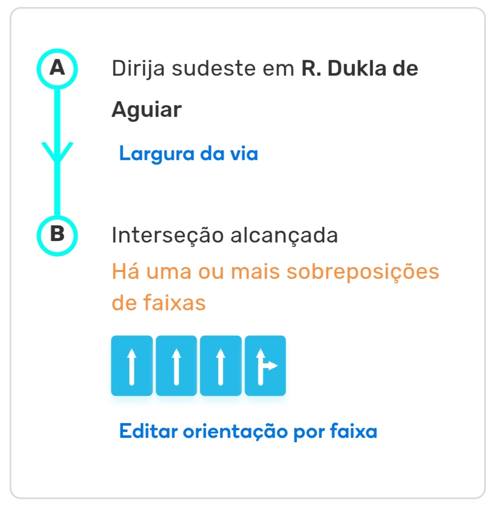 Observação: Alguns tipos de edição, como alteração das conversões permitidas/proibidas, ou então que alterem os segmentos de entrada/saída de uma junção onde existem orientações por faixa configuradas podem colocá-la em estado inválido. Nessa situação, a orientação deixará de ser exibida no aplicativo, e no WME ela será exibida conforme abaixo.