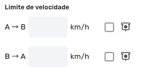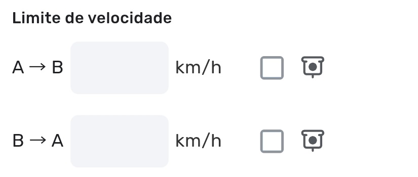 Os campos de velocidade correspondentes aos sentidos habilitados no segmento são exibidos. Eles devem ser preenchidos com a velocidade regulamentar no segmento para aquele sentido. Caso haja mais de uma velocidade válida, considere aquela válida para veículos particulares, táxis e motos, e/ou aquela válida na maior quantidade de pistas. Preste atenção na unidade de medida de velocidade definida nas configurações do WME. A velocidade no Brasil deve ser registrada sempre em km/h.