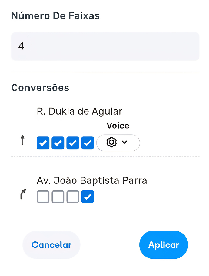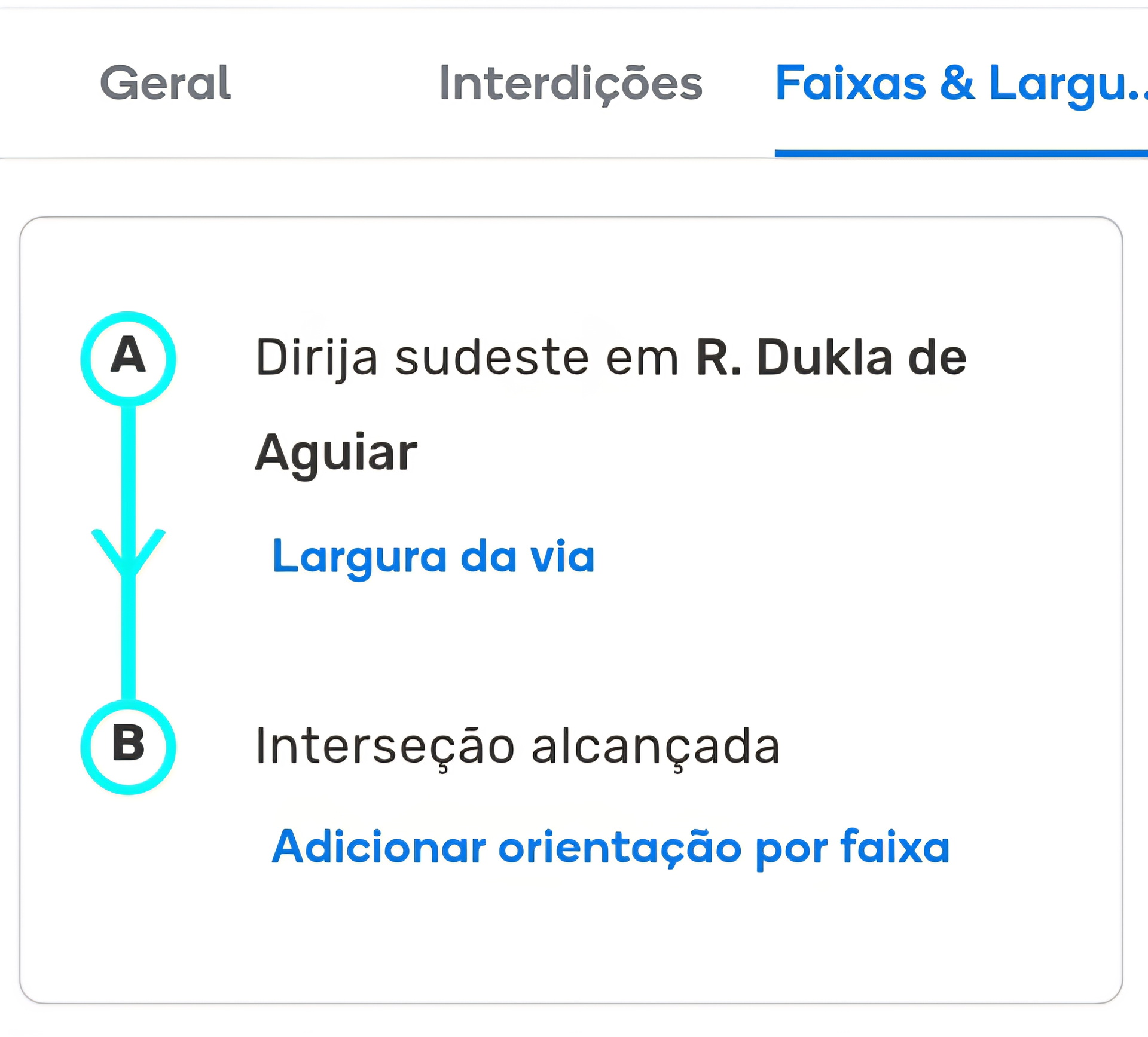 Dica: Largura de via está disponível para editores L2+ enquanto Orientação por faixa está disponível para editores L4+ . Veja mais em Níveis de Edição.