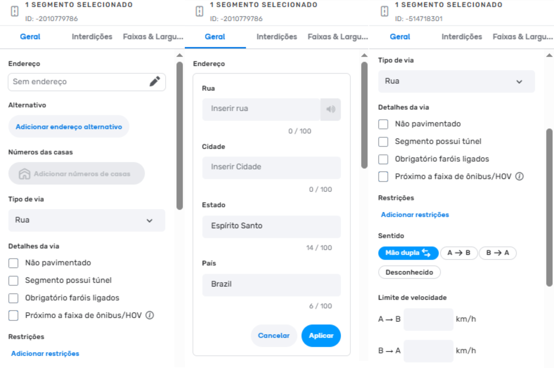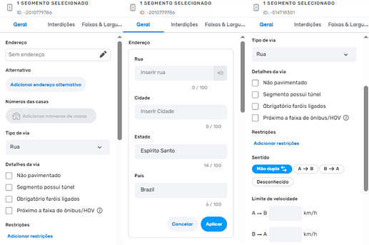 Para editar o endereço do(s) segmento(s) selecionado(s) encontre a frase Sem endereço no painel de propriedades, à esquerda do editor. Clicando nele e aparecerá um conjunto de propriedades da via a serem definidas. Verifique se os parâmetros país e estado estão corretos, pois pode haver erro próximo a fronteira e divisas. Em seguida defina o nome oficial da rua e a cidade.