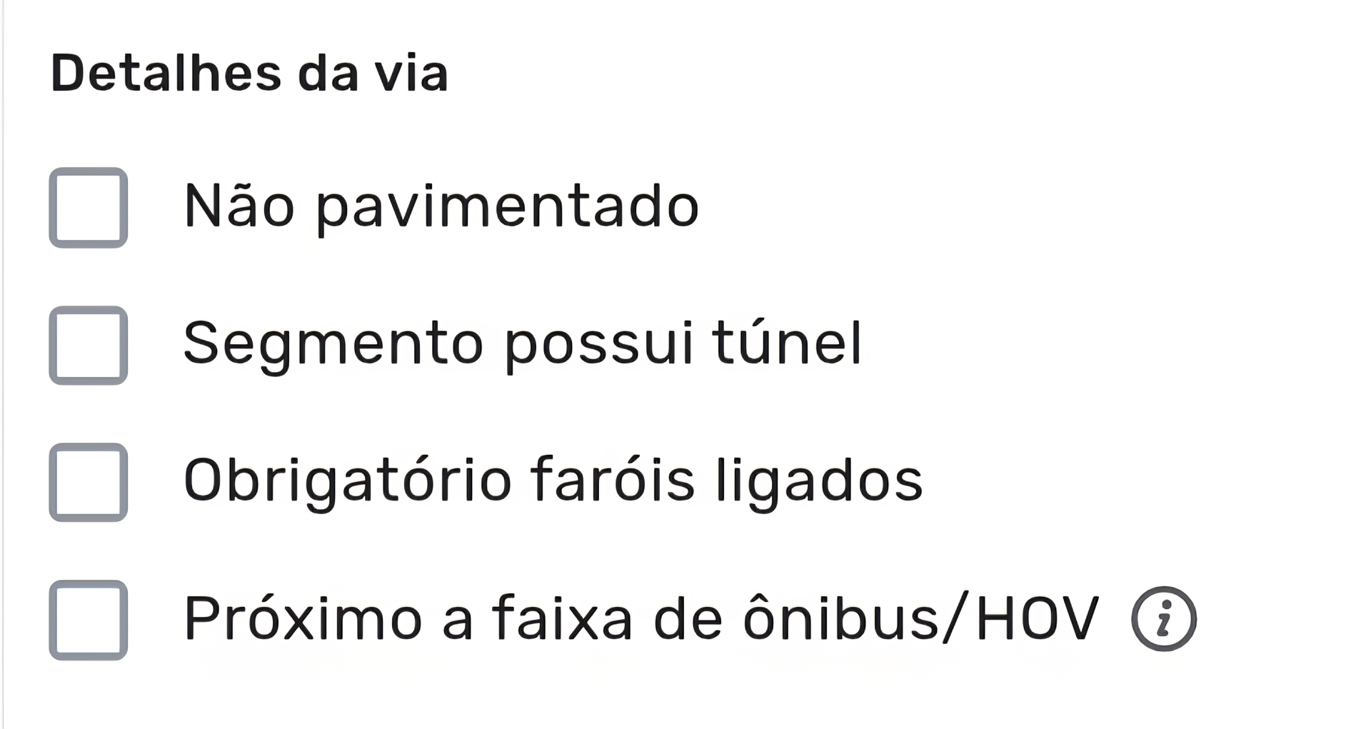 Próx imo a faixa de ônibus/HOV - Use esta opção se o segmento estiver ao lado de outro segmentos marcado como faixa como faixa de ônibus ou HOV (faixa de Alta Ocupação). Isso garante que desvios do GPS sejam considerados ao calcular o tempo de chegada.
