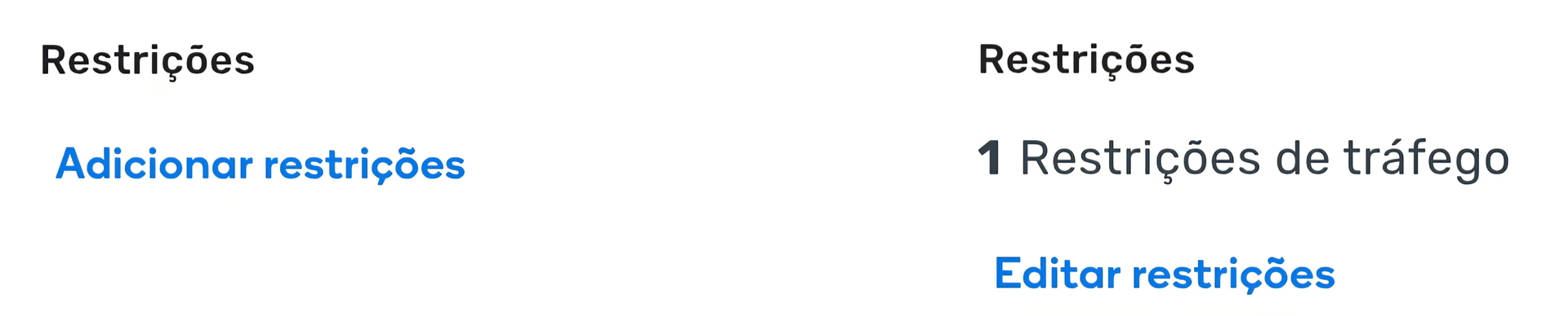 Possui um botão que terá a legenda Adicionar restrições caso o segmento não tenha nenhuma restrição cadastrada, ou “Editar restrições” com a informação da quantidade de restrições, caso possua uma ou mais restrições cadastradas.