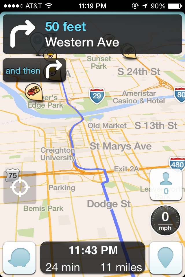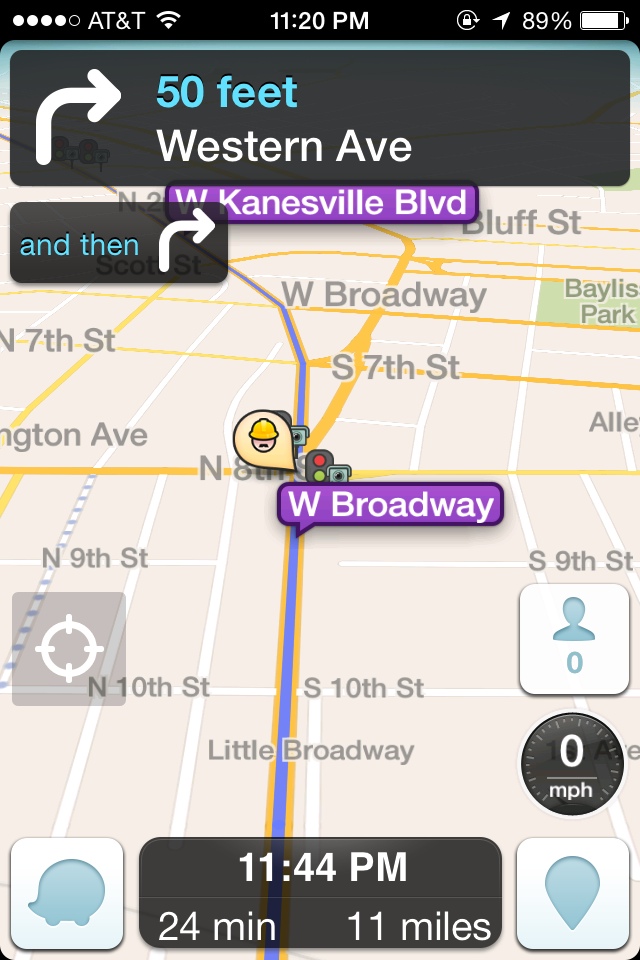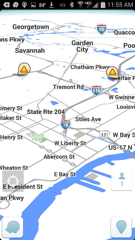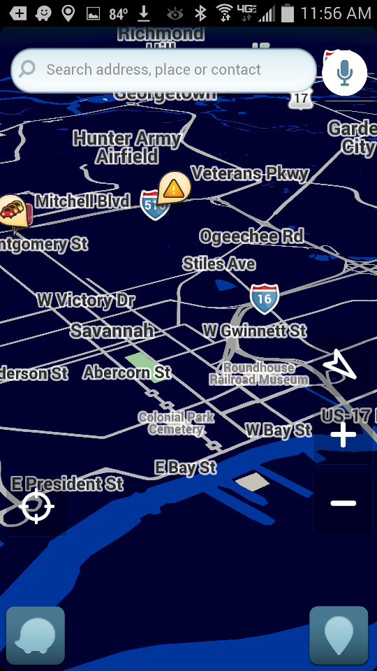 Waze also includes one night color scheme. This is activated by choosing “Night” mode in the Settings menu, or by leaving “Auto” enabled and using Waze at night.
