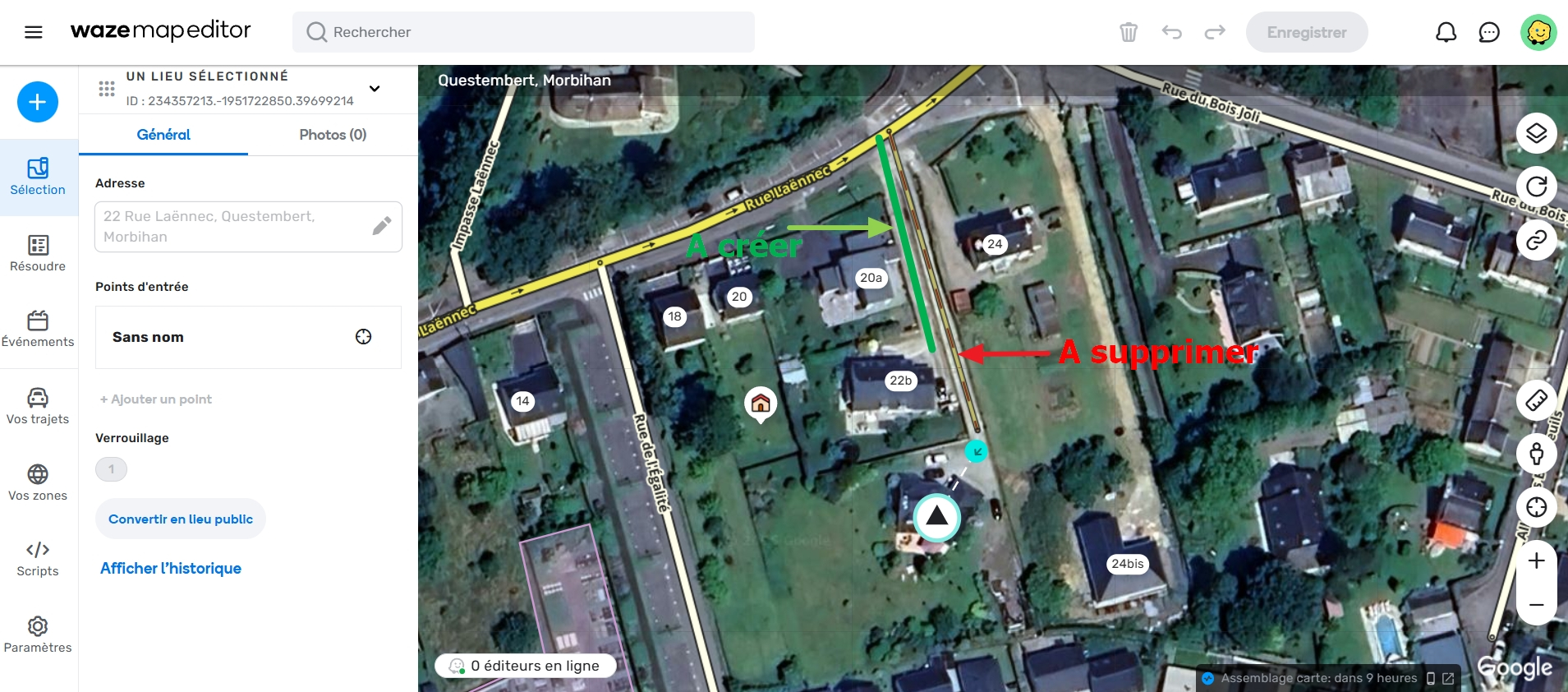 Je souhaite corriger la fin de la Rue Le Roux Borri à Questembert (Morbihan) dans le Waze Map Editor.
