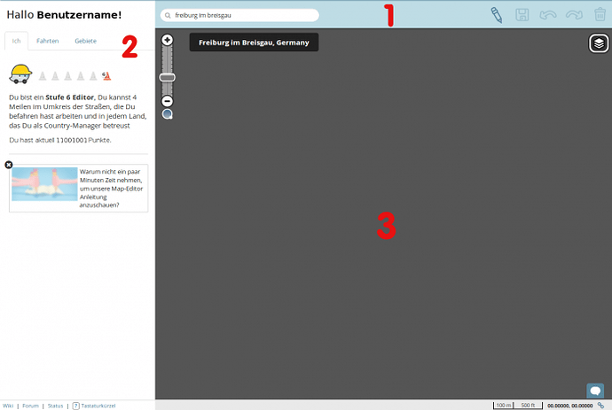 - Der Karteneditor öffnet sich in der Regel an der Stelle, wo Du als letztes gearbeitet hast. Es sei denn Du löschst den Cache deines Browsers.