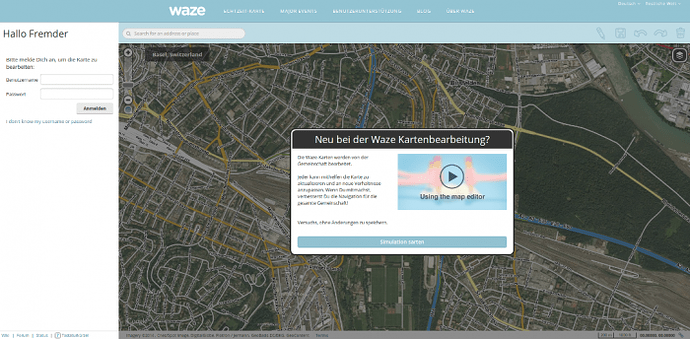 - Anmeldung im Waze-Konto mit dem Benutzernamen auf der Waze-Homepage, der Link zur Anmeldung befindet sich oben rechts auf der Seite