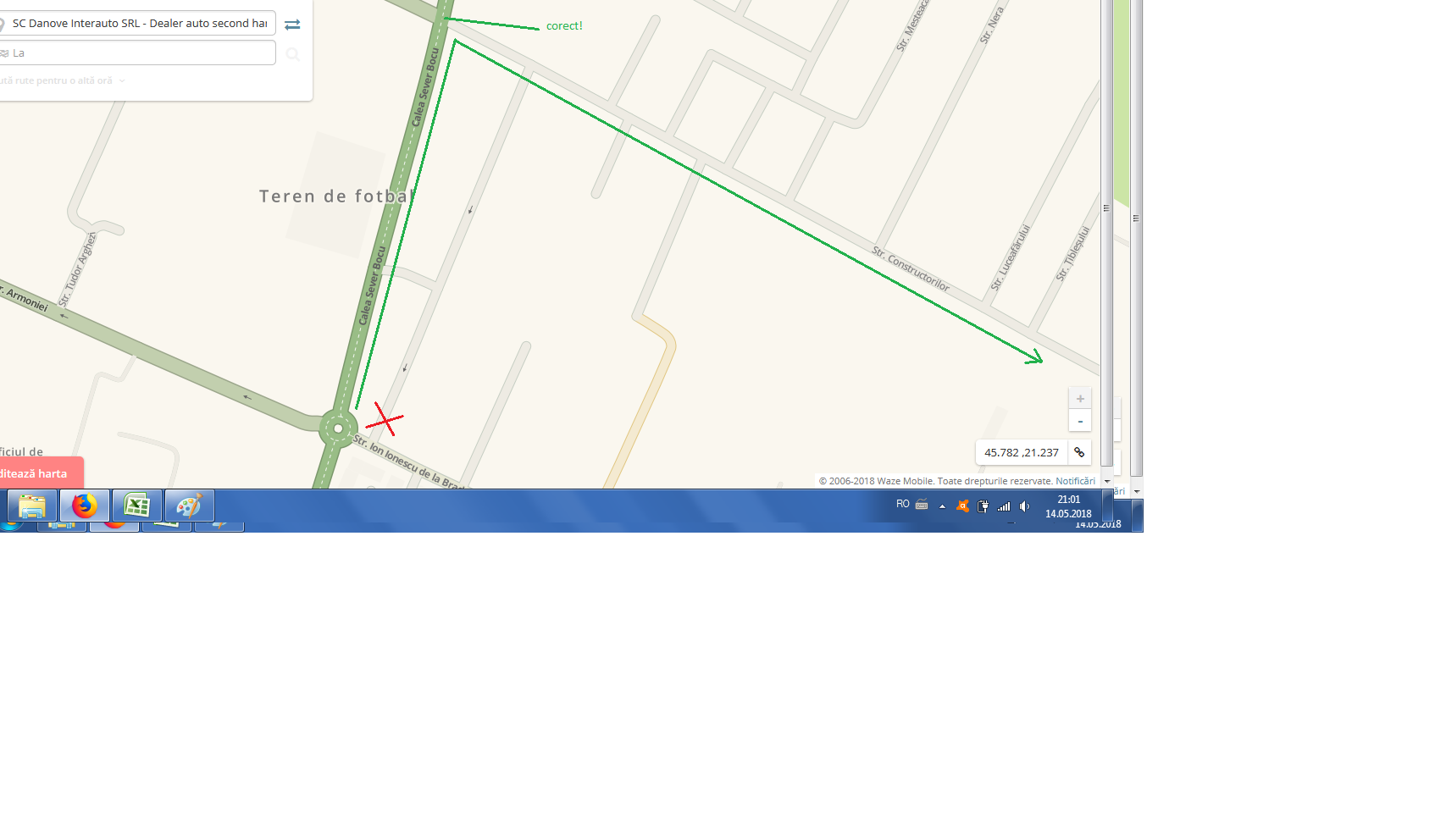 am o mica problema si as avea nevoie de interventia unui editor cu experienta. Mai multe persoane s-au plans ca nu reusesc sa ajunga la firma noastra situata la adresa Constructorilor 38 Dumbravita, Timis - permanent link https://www.waze.com/ro/livemap?zoom=17&lat=45.77809&lon=21.24753. Cei care ne cauta trebuie sa aleaga ruta alternativa pentru a ajunge la noi, deorece prima ruta nu este accesibila, numai exista drumul.