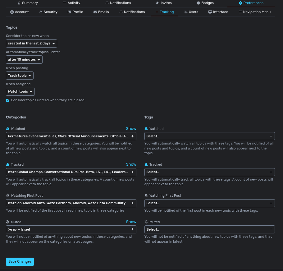 Tracking” gérer les notifications, les sujets et les tags pour lesquels tu souhaites être notifié (ou pas avec la section “