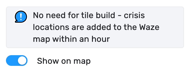 - Show on map: This toggle is what pushes a Crisis location to the map. Only enable it when the location is open to the public, or will be open imminently.