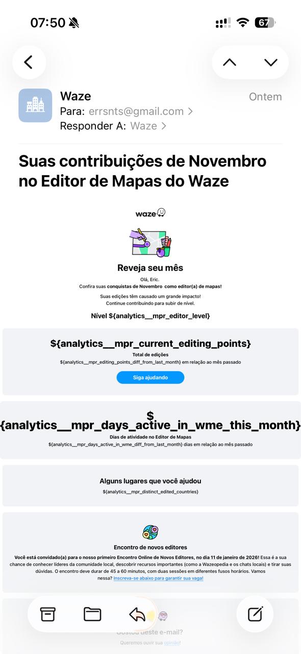 Interrompemos o envio do E-mail de Contribuições Mensais no Editor de Mapas do Waze devido a um problema técnico.