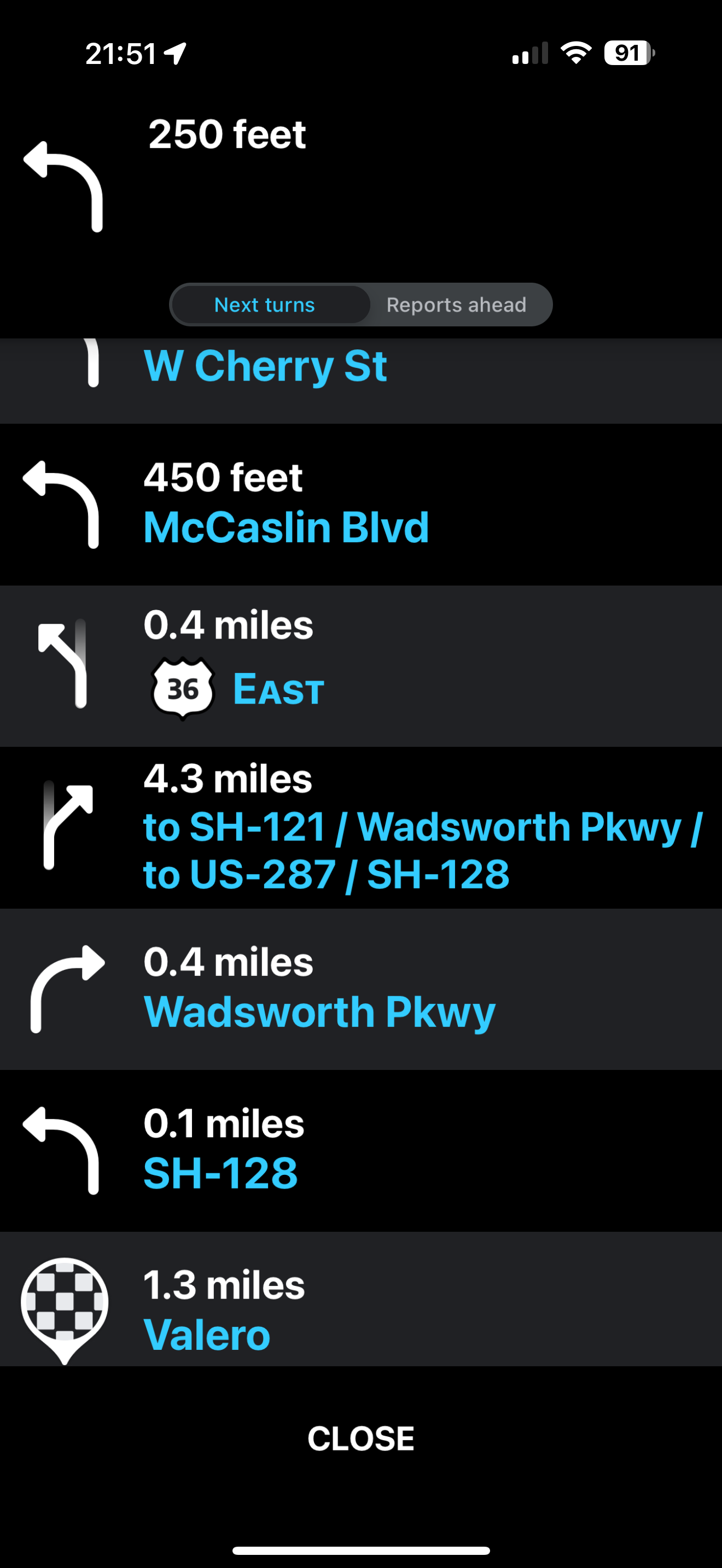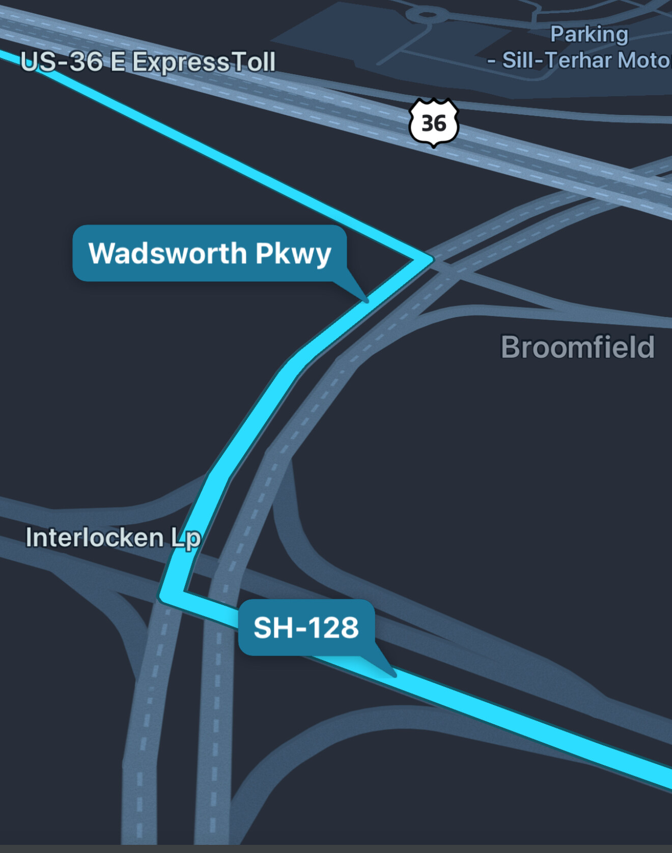 When going from points west to a location on SH 128 in Broomfield, Waze routes you down US 36, has you exit at Wadsworth and then tries to have you turn left at SH 128.